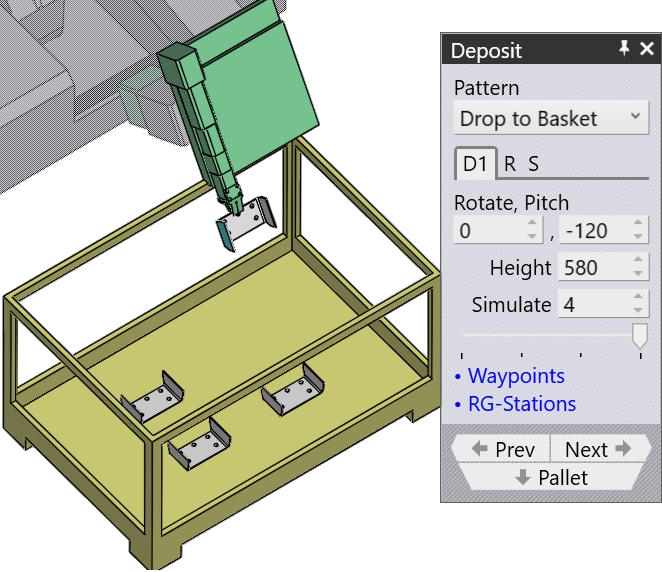 This pattern is used to drop small parts into a collection basket, using the mechanical gripper.