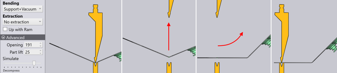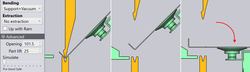 The No extraction strategy means that the part is not actually extracted out of the beam and then brought back into position for the next bend. Instead, the part directly proceeds to the next bend with just a pitch rotation to align it for bending. It can be used only when the two bends are adjacent bends on the same side of the part (no part turn required).