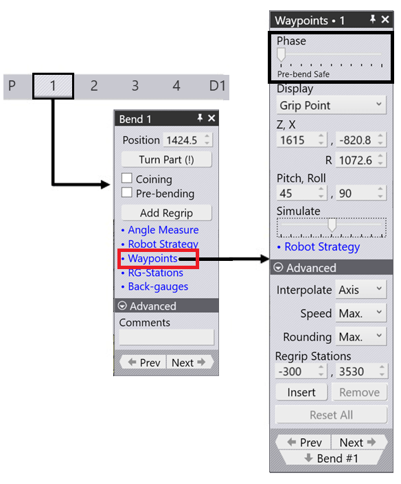 Each movement of the BendMaster consists of waypoints which are passed one after the other. All waypoints of a movement are determined by Bend, but most of them can be adjusted. Points that are directly related to the tracking during the bending process cannot be changed. The adjustment of waypoints is done on two levels. On the one hand, the position of a point can be changed, on the other hand, driving properties such as speed and interpolation can be adjusted. If necessary, a further waypoint can be added at the desired position