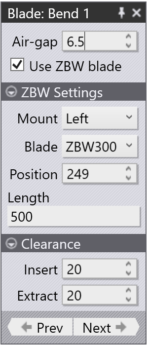 The Use ZBW blade toggle can be used to turn on or off the use of ZBW blades for this bend. If the bend is too long, or no ZBW blades are available, this may be greyed out (moving the mouse over the checkbox will tell you why it is greyed out).