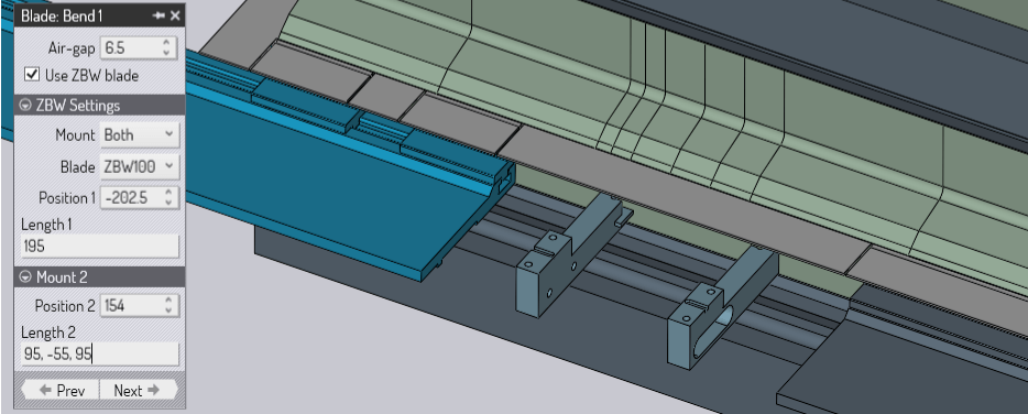 The image above shows Both mounts being used. There is now an additional section that allows you to enter the position and length of the second mount. The Length 2 setting has been set to 95,-55,95. This means that there is a 95 mm section of the blade, a 55 mm gap, and an additional 95 mm section of the blade. Positive numbers are used to indicate blade lengths, while negative numbers indicate gaps between blade segments. The measurements always start from the reference edge of the blade carrier (the edge closest to the back gauges).