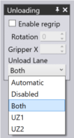 Note: If the part is too big for the Uz1 or the Uz2 lanes, those entries are greyed out. If the part is too big for both lanes, even the Both setting is greyed out.