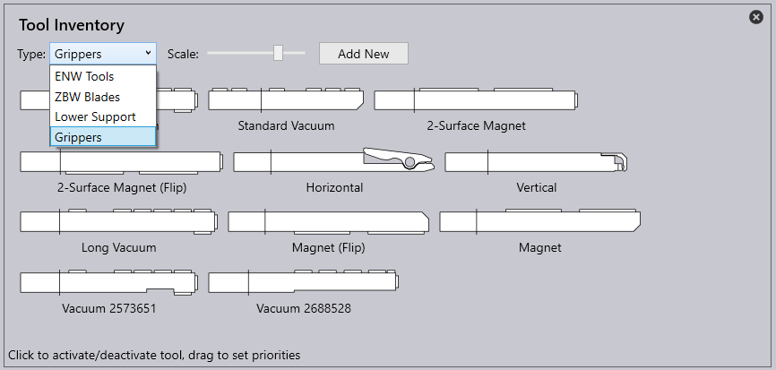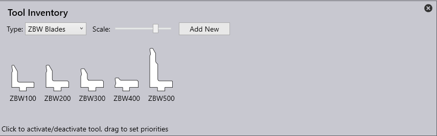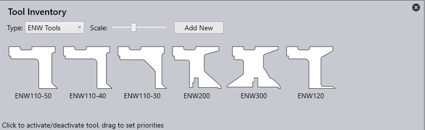 Use the Type selector to pick the ENW tools or ZBW blades that are available for Fold to use. When editing these tools, clicking on a tool toggles between being available or unavailable. In addition, you can rearrange these tools in a different order (by clicking and dragging a tool to a different location). Fold uses this ordering as the tool priority and tries to use these tools in the specified order. For example, in the image above, Fold will try to process a part using the ENW110-50 tool before it tries to use the ENW110-30 tool.